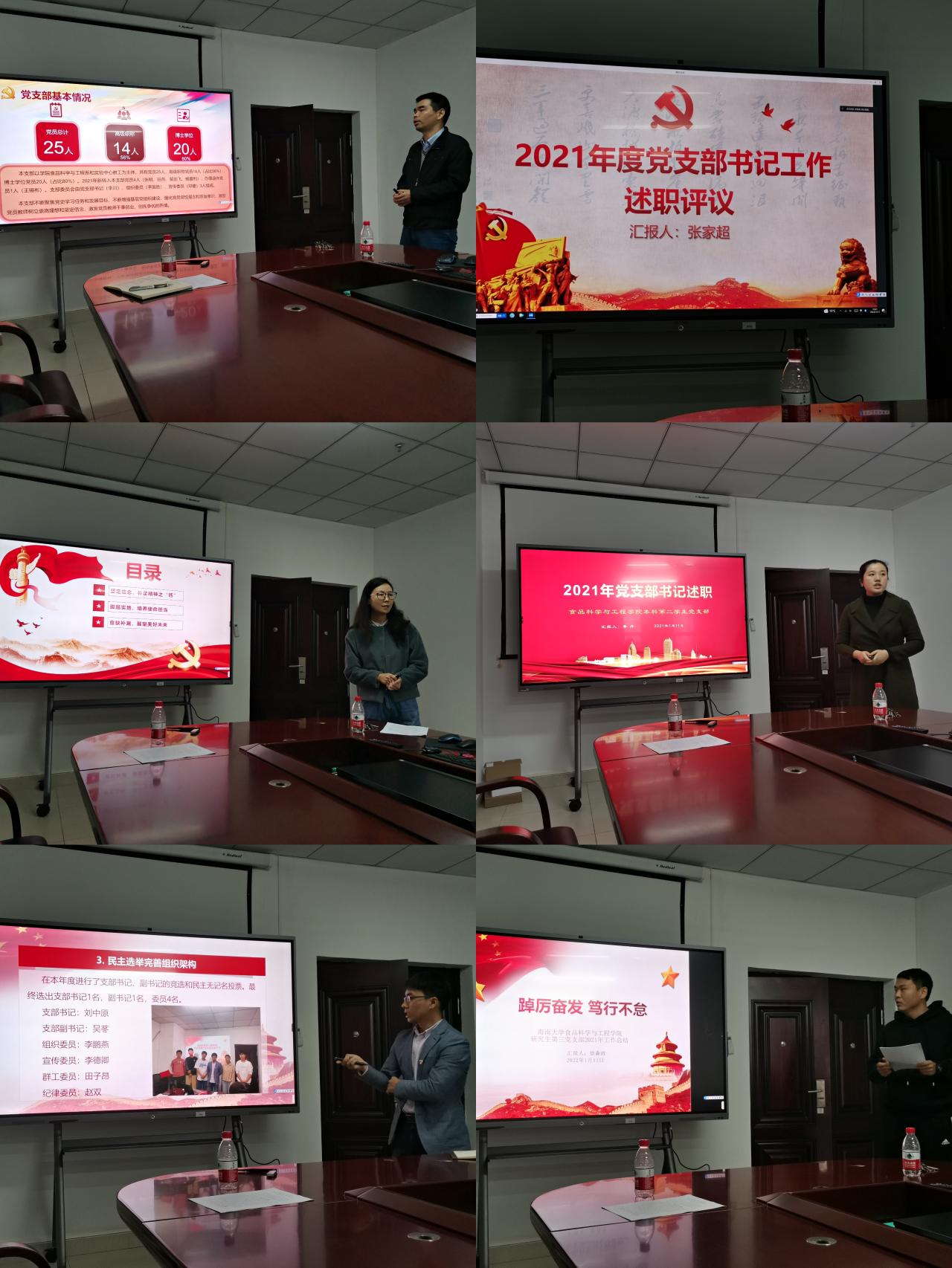 会前,各支部书记认真学习了海南大学《关于开展2021年度党组织书记抓基层党建述职评议考核工作的通知》精神,并要求根据工作职责,结合支部工作实际,撰写述职报告。会上,教工支部书记李川、张家超,学生支部书记欧少红、刘中原、李丹、杨玉珅、徐森政结合党史学习教育专题,分别从党员教育、党员管理、党员服务、党员监督等方面谈了支部党建工作开展情况、存在的问题及下一步打算。邓秀成书记充分肯定了各支部成绩,对存在的不足进行逐一点评。邓书记要求:一是进一步将党史学习教育成果转化为支部和党员干事创业的强大动力,推进特色工作,增强服务意识,提升党组织凝聚力。二是注重实践,强化锻炼,不断提升党建工作与业务工作的新融合,提高开展工作的新本领,服务学校学院中心工作。三是立足大局,准确定位工作新思路,紧扣新一年学校三大综合改革工作重点和主题,在基层组织工作落实、支部书记抓党建工作、支部标准化规范化巩固、样板支部创建、支部特色建设等方面下功夫。
