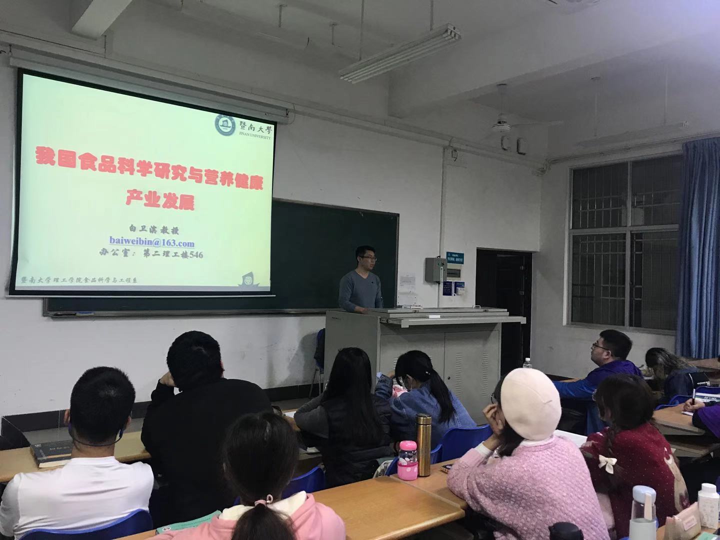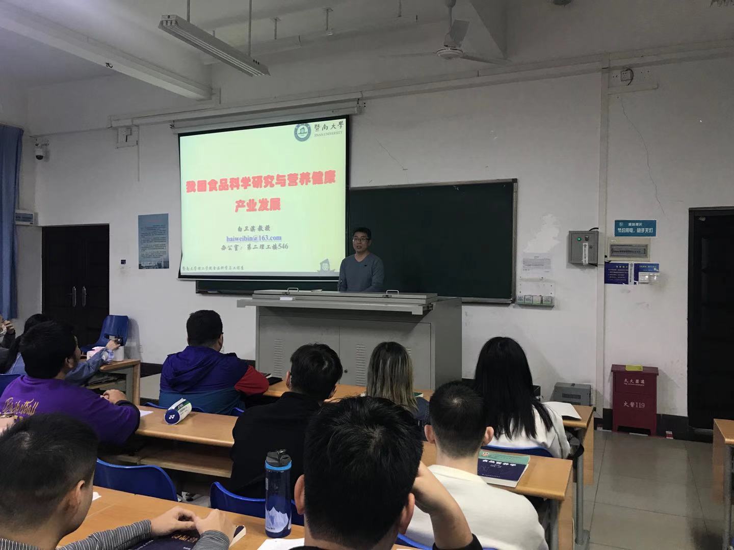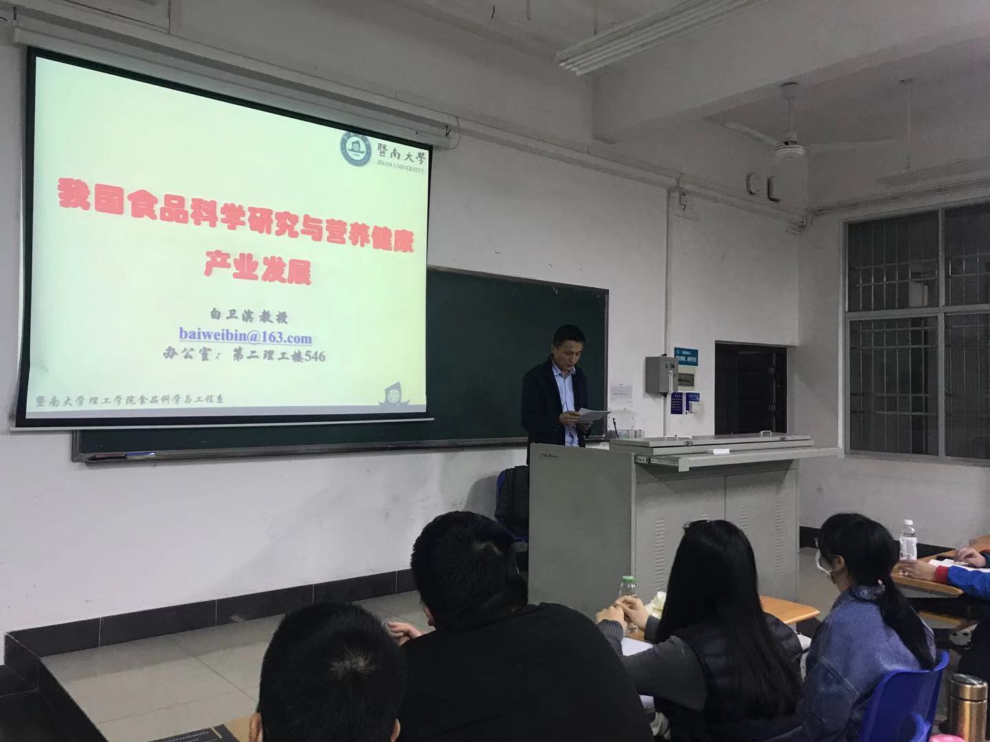 在开始上课前,我院李武副院长对白卫滨教授进行简要的介绍:白卫滨教授现任暨南大学理工学院副院长,兼食品科学与工程系主任、食品安全与营养研究院常务副院长,广东省食品安全分子快速检测工程技术中心主任,广东省食品学会青年工作委员会主任,中国食品科学技术学会第三届青年工作委员会委员,食品领域TOP期刊 Critical Reviews in Food Science and Nutrition 和Food and Chemical Toxicology杂志客座主编。入选教育部新世纪优秀人才支持计划,广东省高校优秀青年教师培养计划。任暨南大学食品安全与营养方向学科带头人,主要研究方向为富含花色苷果蔬的产品开发及功能研究、食物中有害物风险评估及营养干预、食品分子快速检测溯源技术等。近五年主持了国家自然科学基金 3 项,国家重点研发计划课题任务1 项,“十二五”国家科技支撑计划课题 1 项,广东省重点研发计划1项,广州市民生科技重大专项1项。以第一作者或者通讯作者发表学术论文 50 余篇,其中已第一或者通讯作者发表在食品领域top 期刊《Critical Reviews in Food Science and Nutrition 》、《Journal of Agricultural and Food Chemistry》、《Food Chemistry》等SCI论文30余篇。申请发明专利10项,授权 5项,并转让1项。起草地方标准2项(第一和第二起草人)。参编著作 4 部(其中副主编 1 部)。