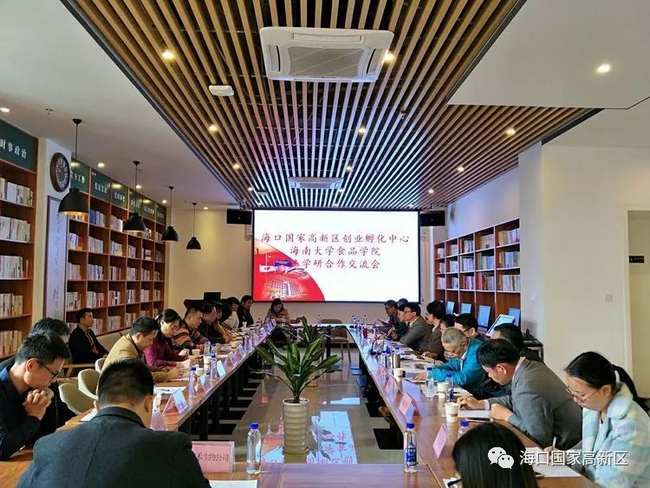 2018年1月23日上午,海南大学食品学院与海口高新区在高新区创业孵化中心举行了产学研合作交流会议。借助此次产学研交流会,海口高新区、海南大学食品学院及园区企业三方进行了深入的交流。参加此次会议的园区企业有:海南椰岛酒业,海南晶辉盐业,海南椰国食品,海南康美食品,海南大白康健医药,海南南春椰子,海南鑫禾,海口椰彩食品,海南椰生堂等公司。海南大学食品学院院长李从发,科研副院长史学群、学院副书记王红英和部份教师出席了此次会议。