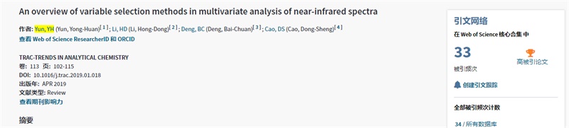 该篇论文题“An overview of variable selection methods in multivariate analysis of near-infrared spectra”,于2019年4月在JCR一区分析化学top期刊《TrAC Trends in Analytical Chemistry》(2020影响因子为9.801)正式发表(https://www.sciencedirect.com/science/article/pii/S0165993618304709)。此篇论文得到国家自然科学基金(21705162)及海南大学高层次人才引进科研启动项目(KYQD(ZR)-1844)的资助,这是我院以第一单位发表的第三篇ESI高被引论文,充分证明我院科研实力的不断提升。