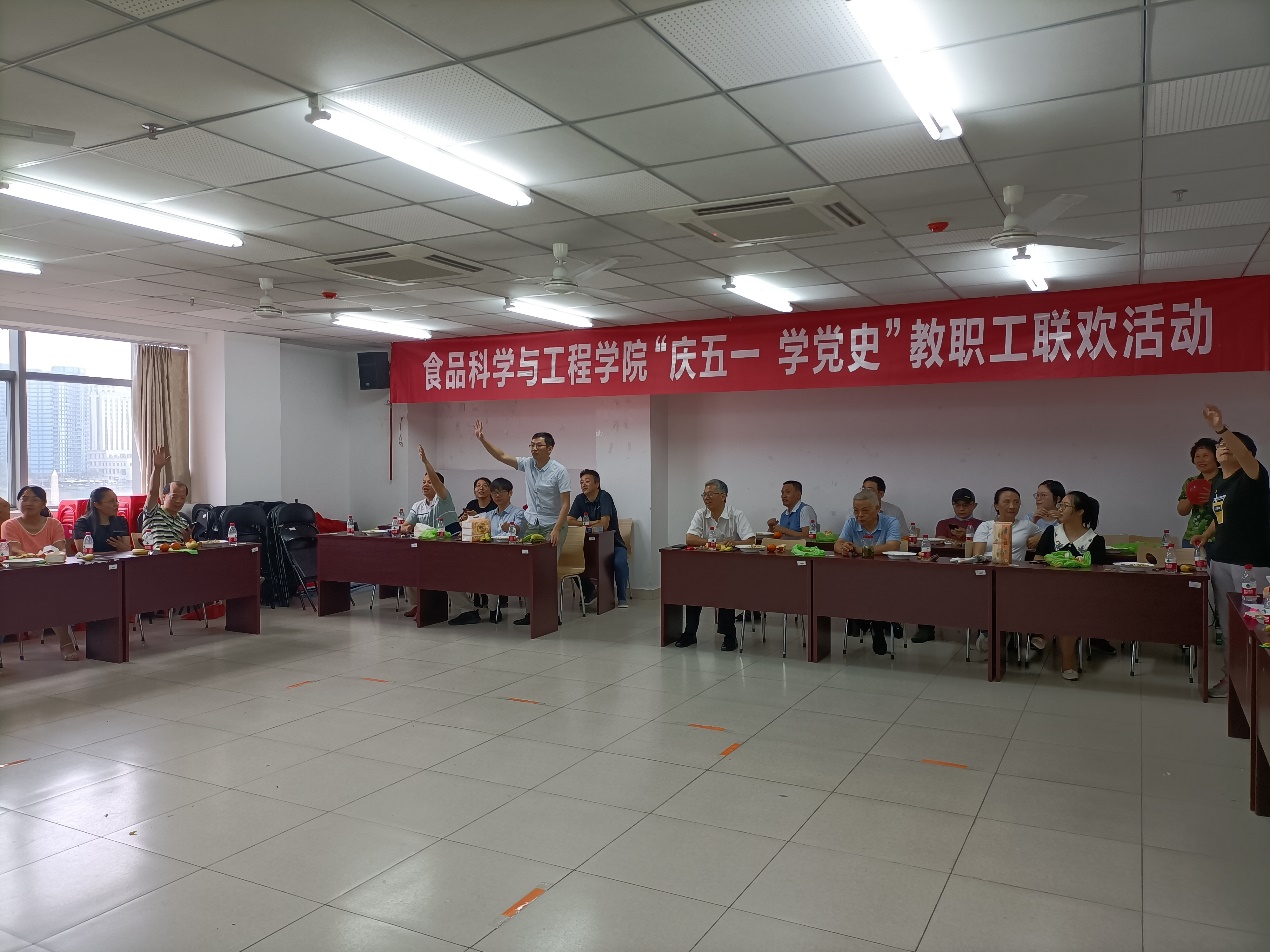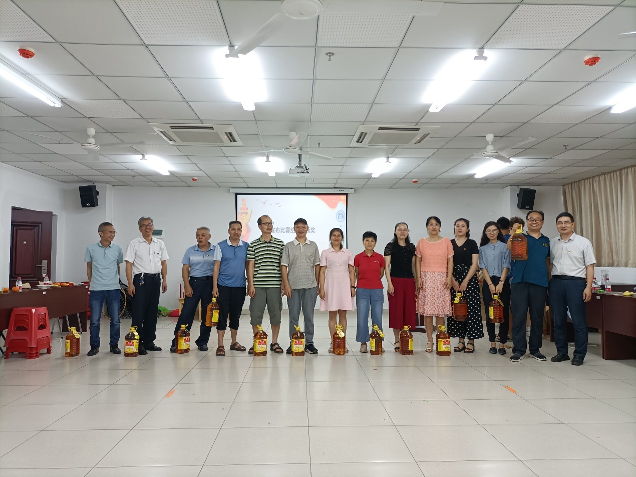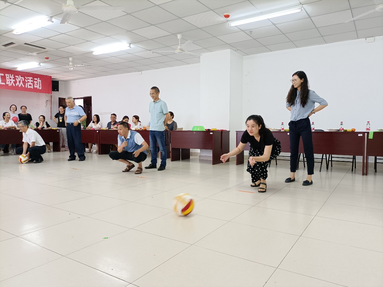 活动在全体教职工合唱“没有共产党就没有新中国”歌曲中拉开帷幕,党史知识问答和团队趣味活动交叉进行。党史知识问答活动中,教职工们积极思考,主动举手抢答,气氛热烈紧张而又愉快放松,“一大会址、中国共产党的最高理想和最终奋斗目标……”等党史知识更加深入人心;趣味活动中,教职工团结协作,斗志昂扬,奋力拼搏,展现了各自的风采,活动现场变成了欢乐的海洋,大家纷纷表示这些活动放松了身心,愉悦了心情,又提升了团队的合作能力。在活动中学院还举行了教职工荣休仪式。仪式上,康丽如、蔡锦红两位老师回顾了自己在学院工作的点点滴滴,表达了对工作的深深眷恋和对学院发展的祝福,现场的同事也纷纷送上了对两位老师的美好祝愿,邓秀成书记代表学院为他们送上了慰问品;在发奖环节,各个参加活动的教职工和团队都欣喜地收到了学院工会为大家准备的奖品,活动也在欢乐的气氛中落下了帷幕。