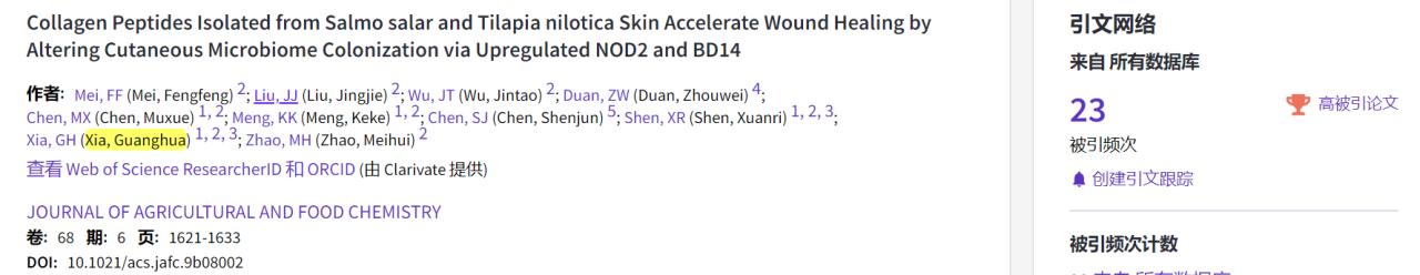 近日,根据ESI公布最新数据显示,海南大学william威廉英国官网水产品加工与贮藏团队夏光华副教授课题组在农林科学SCI一区Top期刊《Journal of Agricultural and Food Chemistry》发表的封面文章“Collagen Peptides Isolated from Salmo salar and Tilapia nilotica Skin Accelerate Wound Healing by Altering Cutaneous Microbiome Colonization via Upregulated NOD2 and BD14”入选全球前1% ESI高被引论文。