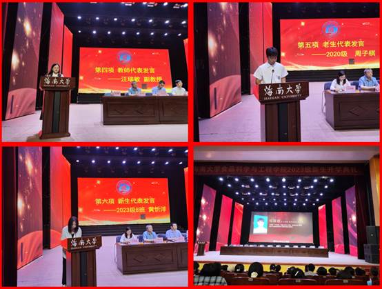 开学典礼上,教师代表汪瑞敏副教授、在校生代表2020级周子棋、本科新生代表2023级8班黄忻洋等分别进行精彩发言,分享了为师、为人、为学的收获与体会,勉励同学们响应时代召唤,努力拼搏,强国有我。与会人员共同观看了学院历年获得海南大学大学生年度人物的学生事迹视频展播,充分展现了学院浓厚的学术氛围和优良的育人环境。