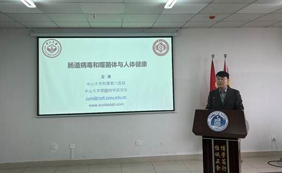 2023年12月27日上午,我院邀请中山大学胃肠病学研究所副所长、国家高层次青年人才左涛研究员在研发楼610会议室作了题为“肠道噬菌体和病毒与人体健康”的学术报告。报告由李川副院长主持,学院邓秀成书记等院领导、部分教师和研究生聆听了报告。