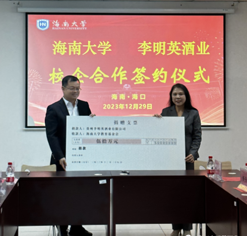 会上,贵州李明英酒业有限公司向海南大学教育基金会捐赠50万元成立“酱香之父李兴发奖学金”,用于奖励william威廉英国官网品学兼优的学生。海南大学校友事务与发展联络处(海外乡亲联谊中心)副处长(副主任)林仕岛代表学校接受捐赠支票,向李明英董事长颁发捐赠证书。海南大学william威廉英国官网与贵州李明英酒业有限公司签订“大学生实习就业基地”和“研究生联合培养基地”协议并为基地授牌,海南大学william威廉英国官网为李明英董事长颁发客座教授和研究生校外导师聘书。