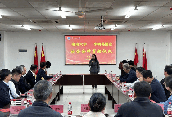 海南大学党委常委、副校长邹勇华出席本次活动并致辞,他指出:“希望校企双方共同在人才培养、科学研究等领域深度合作,校企携手、优势互补、强强联合,共同推动产、学、研一体化融合发展。”李明英董事长表示:“感谢海南大学各位领导和老师的信任与支持!公司的发展离不开社会关心与帮助,李明英酒业酱酒技术是家族传承,更是社会的财富,帮助青年大学生成才,是企业的社会责任。” 仁怀市酒业协会副秘书长张小波表示:“这次签约仪式不仅可以拓展海南大学教学科研影响力,更有助于提升李明英酒业公司酱香白酒生产技术,一定能给校企双方带来合作双赢的契机。”